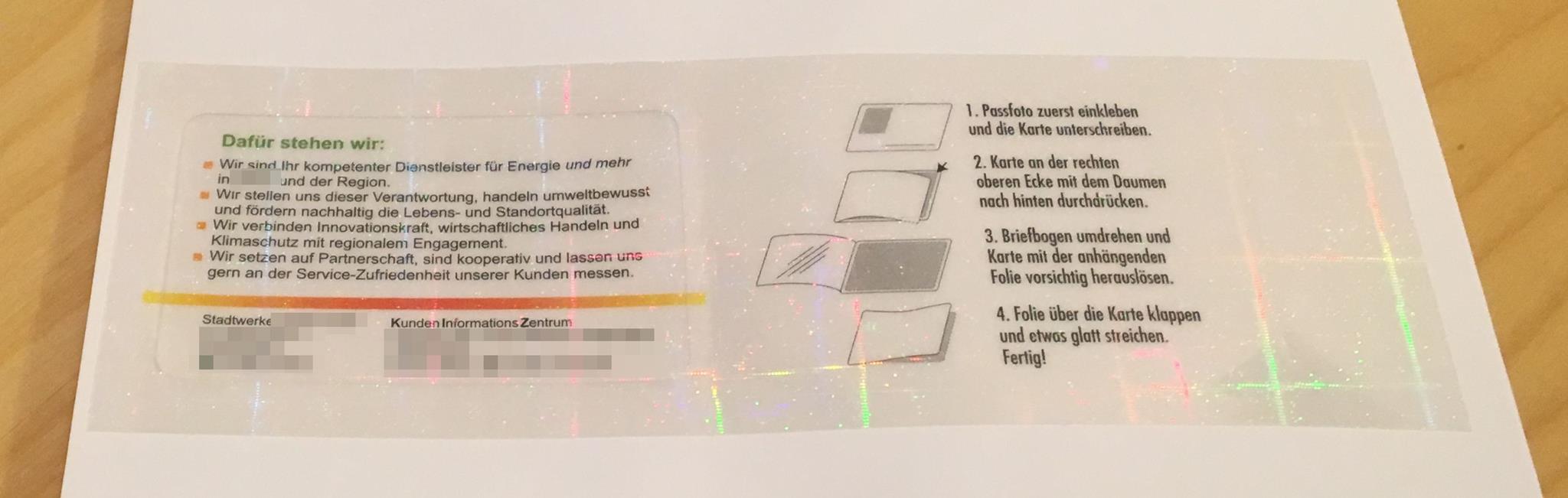 - Laminat der Karte: entweder klar oder mit Standardhologrammfolie (Fäschungssicherheit)